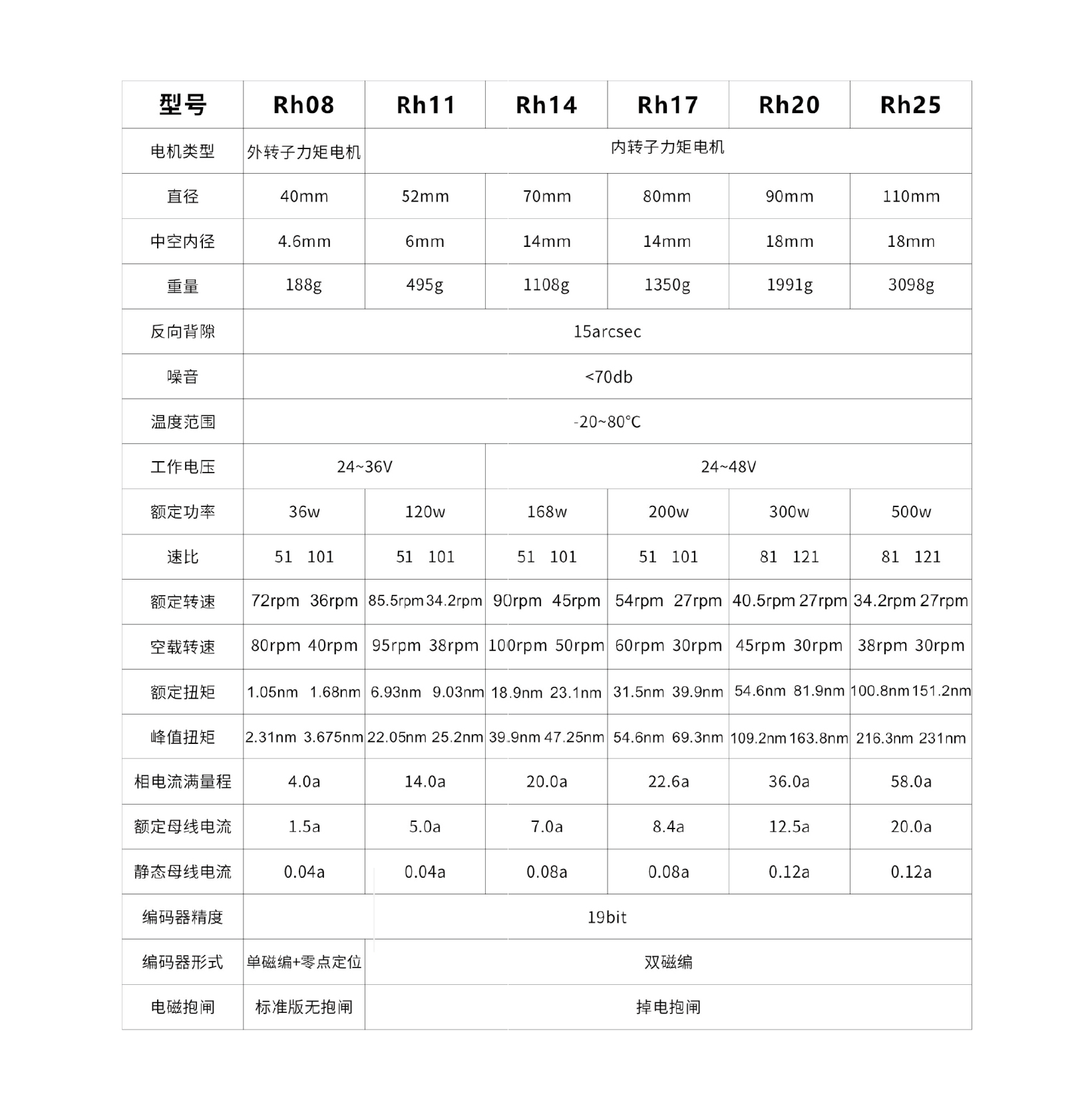 The core technology of the product lies in the harmonic integrated joint module, featuring a drive-control integrated design. The inner rotor structure enables hollow cabling, while diversified model options including 11, 14, 17, 20, 25, 32 and 40 series ensure flexible applications. With a compact and miniaturized profile and low power consumption, it adopts a pin-type brake mechanism that triggers mechanical locking instantly upon power loss, with an action time of less than 10ms.