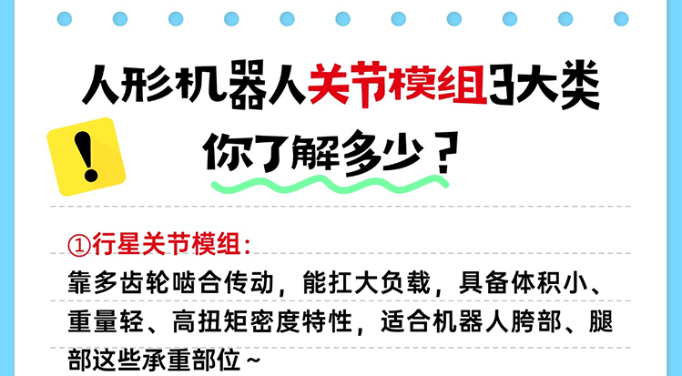 选人形机器人关节模组,是不是搞不清楚各种类型的区别?其实,根据减速器的不同,关节模组主要分为行星关节模组、谐波关节模组和摆线关节模组三种类型。①行星关节模组:靠多齿轮啮合传动,能扛大负载,抗冲击性强,具备体积小、重量轻、高扭矩密度特性,适合机器人胯部、腿部这些承重部位~ ②谐波关节模组:通过柔轮变形传动,精度超高,背隙接近零,可抗冲击性弱些,适合机器人腕部、小臂等需要精细动作的部位。③摆线关节模组:通过摆线减速器实现高精度、高负载的传动,具有大扭矩、高负载和高效率的特点,体积介于前两者之间~我们良质关节,一直致力于关节模组的研发生产,产品涵盖谐波关节模组、行星关节模组等,为人形机器人提供核心驱动解决方案🤖以上这三类关节模组,只有按需选对类型,机器人才能更灵活!